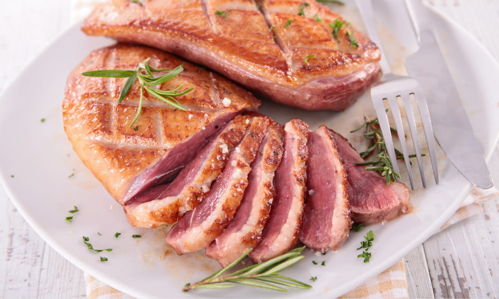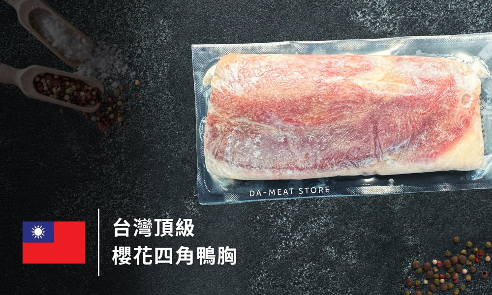 由櫻桃谷牧場培育的北京鴨(櫻花鴨)品種,肉質結實飽滿、纖維細嫩,油脂分布也很均衡,連皮帶肉咬下去時,鴨肉的鮮甜汁水會在口中瞬間爆開,超級滿足~ 鴨胸適合用鍋煎、烤箱、舒肥或氣炸等多種料理方式,但記得一定要全熟!